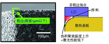 LD芯片配置在正下方的散热基板上,为了不妨碍激光出射且不产生热堵塞,需要锐边。含有柔软的铜和硬质的钻石Cu-Dia材料加工困难,采用独特的加工方法可以实现5µm以下的锐边(图3)