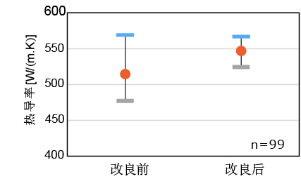 LD为了使与芯片接合性良好,一般在散热基板表面进行金锡、金、铂、镍等金属薄膜成形(以下称为金属化),因此金属化后的热特性也变得重要,通过控制Cu-Dia中的微量元素,如图4所示,与以往产品相比,金属化后的热导率更稳定。